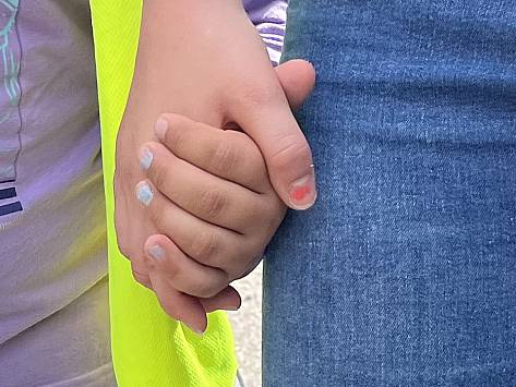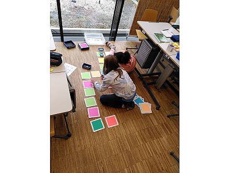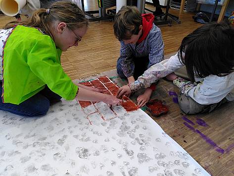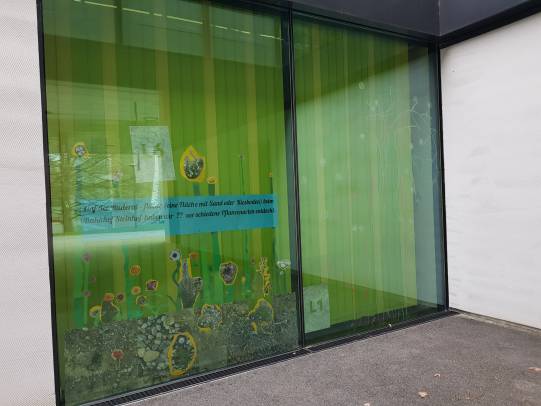 “Schau mal meine Sonne!” - “Ich brauche mehr blaue Farbe.” - “Ups, ich habe Farbe auf meinem Malschutz!” So tönte es am 4. Mai über den Pausenplatz unserer Schule. Auch ich stecke hier mittendrin und suche gerade zwei weisse Plastikhandschuhe zusammen. Die Stimmung ist nicht hektisch, sondern ausgelassen und fröhlich: Wir malen unseren Pausenplatz an! Ich und meine drei Kolleginnen stehen vor einer weissen Plastikplane, die sozusagen als Kontrollzentrum dient. Ein paar nette Mütter aus dem Elternrat sitzen dahinter. Sie haben das ganze organisiert und eingerichtet. Ich und meine Freundinnen bekommen hier nicht nur Farbe sondern auch unseren Auftrag. Weiter hinten beim Kindergarten befand sich ein Gewirr aus bunten Linien, denen man nachlaufen konnte. Wir sollten am Anfang jeder Linie ein Symbol hinmalen. Wir hatten uns schnell aufgeteilt. Ich soll eine blaue Tulpe malen. Gemeinsam und mit Hilfe des Elternrates deckten wir den Boden rund um die Malfläche mit Zeitungspapier ab. Dort konnte man dann bequem draufknien. Die Formen, die wir malen sollten, zeichneten wir vorsichtig mit Kreide vor, denn mit der Strassenfarbe sollten keine Missgeschicke passieren. Ich bekam einen Plastikbecher mit blauer Farbe und einem Pinsel in die Hand gedrückt. Na dann kann’s ja losgehen! Vorsichtig fuhr ich die Linie, die ich mit der Kreide gezogen hatte, nach. Gar nicht so einfach und vor allem dauerte es lange. Ich war mit der Umrandung meines Symbols erst nach meinen Kolleginnen fertig, die eine Sonne und zu zweit noch ein Herz malten. Doch das Ausmalen machte dann dafür umso mehr Spass. Wir konnten gut und viel Farbe auftragen und tunkten den Pinsel weit in die Farbe. Erst als kein Fleckchen mehr vom Boden zu sehen war, waren wir fertig. Nur die Sonne war ein wenig unser Sorgenkind, da die gelbe Farbe nicht so gut deckte wie die anderen Farben. Möglicherweise wird nochmals darübergemalt werden müssen. Um sicherzustellen, dass niemand durch die frische Farbe läuft, holten wir Holzstäbe, die wir um unsere Kunstwerke stellten. So konnten wir von Stab zu Stab ein gelbes Plastikband spannen, damit wirklich jeder sieht, dass er dort nicht durchlaufen sollte. Dann war unser Auftrag abgeschlossen. Auch wenn wir echt gerne noch ein wenig weitergemalt hätten, mussten wir wohl oder übel unsere Handschuhe ausziehen und wieder zurück in unser Schulzimmer. Wir hatten unseren Teil zum grossen Gesamtbild erfüllt, und konnten es am nächsten Montag so richtig bestaunen und nutzen. Wir spielten Himmel und Hölle, oder ein “Farbenfangis” mit bunten Tupfen, die auf dem Schulhof verteilt waren. Und wir freuten uns darauf, uns hier verewigt haben zu können. “Irgendwann wenn ich mal Oma bin” meinten wir, “werden wir über den Schulhof laufen und sagen können: Schau mal, das habe ich damals gemalt!”