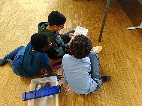 Somit haben auch wir gemeinsam etwas mit Musik entwickelt - nämlich in drei Gruppen drei unterschiedliche Geschichten vertont. Natürlich wurden die Geschichten einander vorgelesen und vorgespielt. Dabei durften alle Zuhörenden entscheiden, ob sie die Geschichten nur mit dem Hörsinn geniessen möchten und eine Augenbinde tragen wollen oder ob sie zuschauen und zuhören möchten.