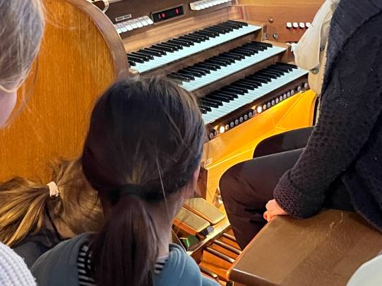 Passend zur Thematik der Instrumente im Musikunterricht, machte die Klasse einen Besuch in der Stadtkirche. Wir durften mit der Organistin Frau Wirz die Orgel etwas genauer unter die Lupe nehmen und neben vielen Hörerfahrungen auch viele Fragen stellen. Wir waren alle sehr überrascht, dass die Orgel viele Instrumente „imitiert“ und man eine Orgel auch mit den Füssen spielen kann.