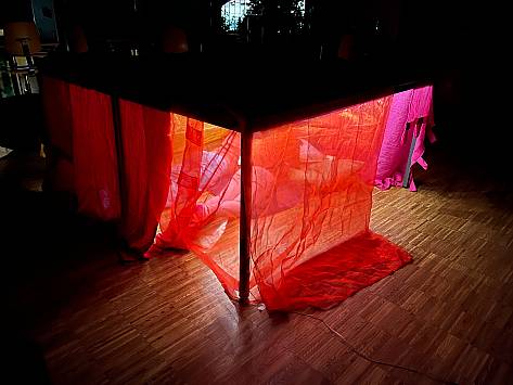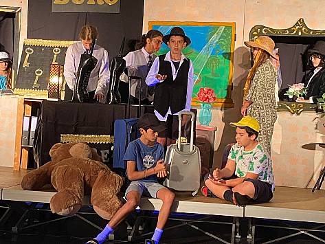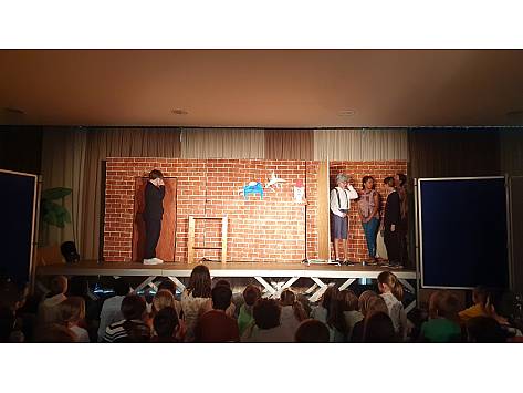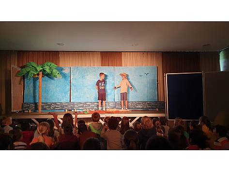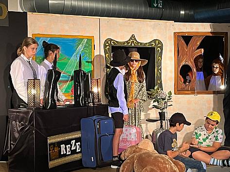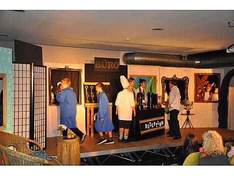 Wir haben mit der Klasse ein Theater gespielt, in dem es um ein Hotel namens Hotel Q-Rioso ging. In diesem Hotel gingen aber gruselige Dinge vor sich. Plötzlich verschwanden Kleider und man hörte gruselige Laute.