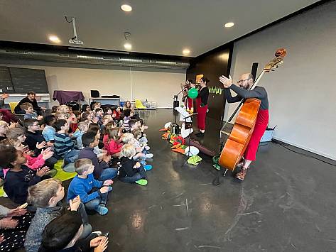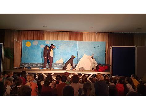 Dann kam der grosse Tag – die Reise nach Bern in den Brückenpfeiler. Dort durften wir auf einer professionellen Bühne, mit Scheinwerfer und Musik unser Stück einem anderen Kindergarten vorführen. Dieser andere Kindergarten spielte anschliessend ihr Stück uns vor.