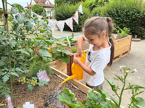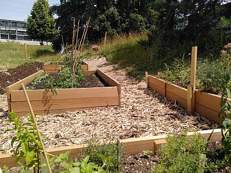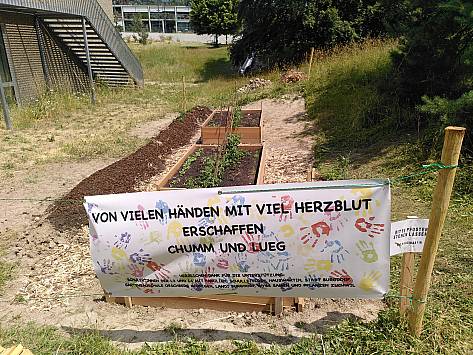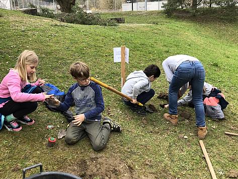 Mit viel Eifer und grosser Freude packten die Kinder an, bereiteten den Boden vor, planten, sägten und bauten Hochbeete, schaufelten etliche Kubikmeter Erde und Holzrinde umher, jäteten stundenlang invasive Neophyten, säten und setzten Pflanzen und entdeckten die Pflanzen und Insekten in der Umgebung des Schulgartens.