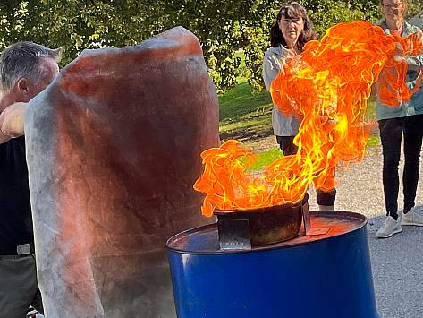 Zackig wurden unter seiner Anleitung die Feuer gelöscht, die zuvor per Knopfdruck mittels spezieller Brandsimulationsanlage entzündet wurden. Was bei Roger Hess so einfach aussah, entpuppte sich als Mutprobe: Die Pfanne mit Öl brennt lichterloh: Da gilt es die Löschdecke so in die Hände nehmen, dass diese geschützt sind. Dann mit ausgestreckten Armen die Decke ruhig über die lodernde Pfanne legen und das Feuer ersticken. „Ruhig, Schritt um Schritt, nie gäg e Wind“, ermunterte Hess. Und: Nicht nur im Zweifelsfall die Feuerwehr zu alarmieren, um ganz sicher zu sein, dass da nichts mehr schwelt, wieder aufflackert.