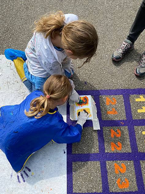 Der Elternrat hatte vor längerer Zeit bereits die Idee eingebracht, den Pausenplatz mit Hüpfspielen zu gestalten und nach den Frühlingsferien war es endlich soweit! Die Schüler*innen durften mit Unterstützung von vielen Helfer*innen aus dem Elternrat verschiedene Spiele auf dem Pausenplatzes aufmalen. Wir freuen uns sehr über die neuen Spielmöglichkeiten und die zusätzliche Farbe rund um das Schulhaus, es sieht super aus!