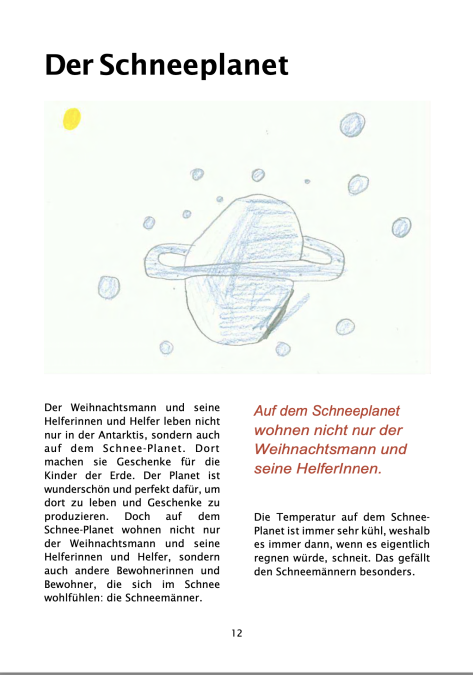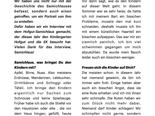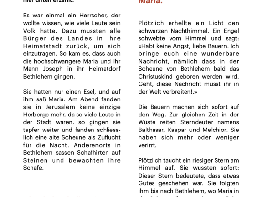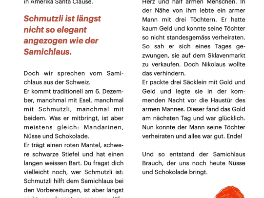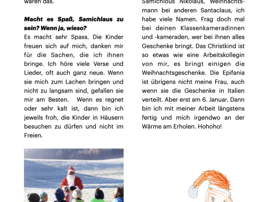 Am Freitag, 2. Dezember 2022 ist das Projekt «SchülerInnenzeitung» der am Recherchieren, Schreiben und Zeichnen interessierten Kinder der Mittelstufe gestartet. Gemeinsam haben sich die Schülerinnen und Schüler für das Thema «Weihnachten» entschieden und sich dabei kreativ - und in Anbetracht der kurzen Zeit ambitioniert - mit unterschiedlichen Darstellungsformen auseinandergesetzt. Innerhalb von drei Treffen ist dabei die nun vorliegende Erstausgabe entstanden. Wir bedanken uns bei Livio Gneist für das Layout dieser Zeitung! Die erste Ausgabe der Zeitung wurde unverändert, d. h. unkorrigiert, zusammengestellt.