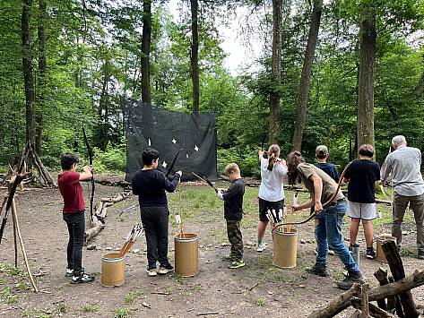 Insgesamt wurden 13 Mal alle 154 Pfeile losgeschickt - und je länger, desto treffsicherer wurden wir. Daneben war Bräteln, Spielen, Schnitzen, Bogenbau und gemütliches Zusammensein mit der Partnerklasse aus der Besonderen Volksschule Untere Emme angesagt. Es war soooo toll!